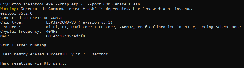 esptool.exe --chip esp32 --port COM5 erase_flash(Замените COM5 на ваш порт)