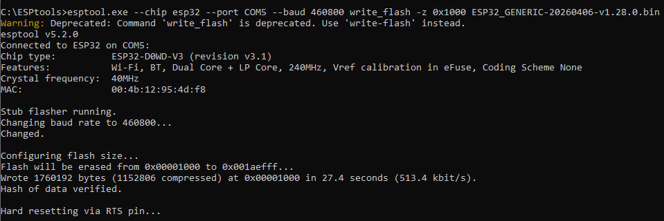 esptool.exe --chip esp32 --port COM5 --baud 460800 write_flash -z 0x1000 ESP32_GENERIC-20260406-v1.28.0.bin (Где ESP32_GENERIC-20260406-v1.28.0.bin – имя скачанного файла)